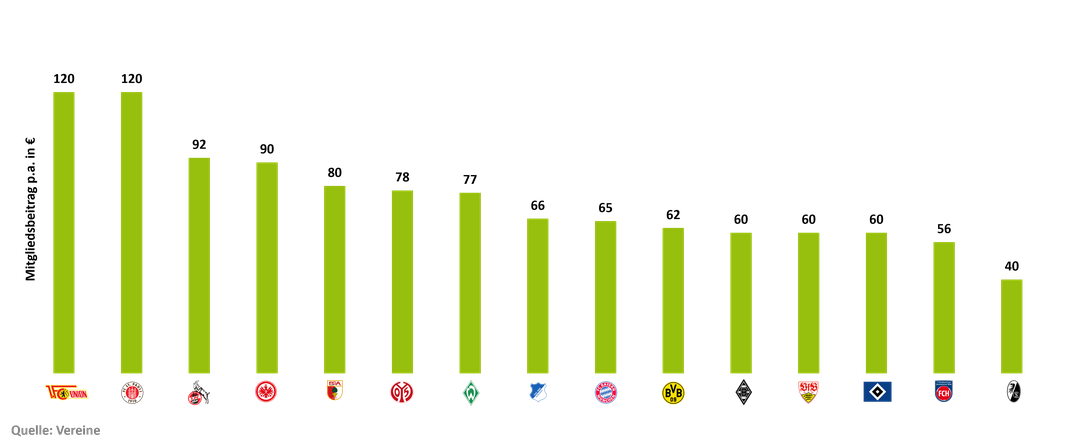 Mitgliedschaften generieren direkte Einnahmen bei Clubs, deren Profiabteilungen weiterhin als eingetragene Vereine (e. V.) geführt werden, aber auch die ausgegliederten Kapitalgesellschaften partizipieren zumindest indirekt. Der jährliche Beitrag für Vollzahler variiert ligaweit von 40 Euro beim SC Freiburg bis zu 120 Euro beim 1. FC Union Berlin (ohne Berücksichtigung von RB Leipzig, Bayer 04 Leverkusen und dem VfL Wolfsburg). Die Beitragshöhe hängt dabei meist direkt mit dem Umfang der inkludierten Vorteile zusammen – etwa Ticketvorkaufsrechte, Rabatte im Fanshop oder exklusive digitale Inhalte. Gleichzeitig hat der Beitrag einen direkten Einfluss auf die Deckungsbeitragsmarge. Im Durchschnitt liegt diese bei der Vollzahler-Mitgliedschaft innerhalb der Bundesliga bei etwa 50 - 70 Prozent (eigene Berechnung) – mit Ausreißern nach oben und unten. Union Berlin kann beispielsweise eine höhere Marge erzielen, da der Leistungsumfang bei gleichzeitig höchstem Beitrag bewusst schlank gehalten wird – insbesondere durch den Verzicht auf margensenkende Vorteile wie Rabatte auf Dauerkarten oder Merchandise-Produkte. Gleichzeitig schafft der Club durch exklusive Vorteile wie den Erwerb von Dauerkarten und Anteilen an der Stadion AG (beides ausschließlich für Mitglieder) einen besonderen Mehrwert.